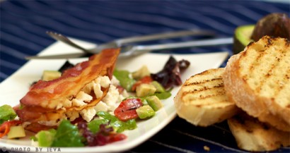 Bacon and Goat Cheese Millefeuille with Bell Pepper and Avocado Salad