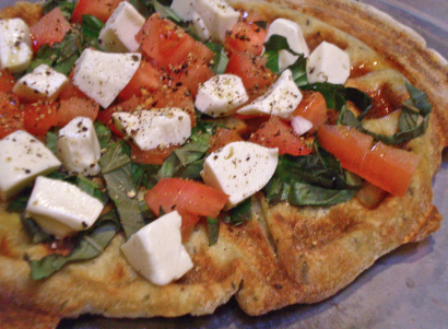 3. Remove and place on a plate. Top with basil ribbons, chopped tomato and cubed mozzarella.