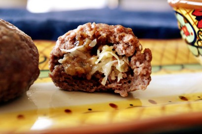 Start by getting about 1 tablespoonful of meat mixture and mashing with your palms to make a flat circle. Just go ahead and make a bunch of these and lay them on your work area, so you can get to the easy part. Sprinkle a little cheese in the middle, followed by a little sauerkraut. Put another circle on top, and pinch the edges to seal and make one meatball. I gently rolled them around in my hands to get a meatball form. It may take a few to get it right; but you’ll find the method that works best for you.