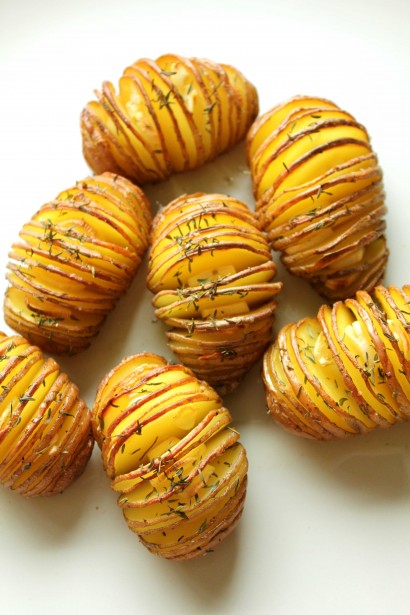 On a cutting board, place one potato in a wooden spoon. Starting from one end of the potato, make slits about 1/8 inch apart. Try to cut at the very bottom of the potato, but not all the way through it. Repeat with the remaining potatoes.