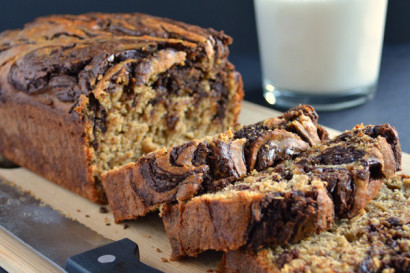 Moist, fluffy banana bread topped with a luscious chocolate swirl. You won’t believe that this delicious treat is gluten-free!