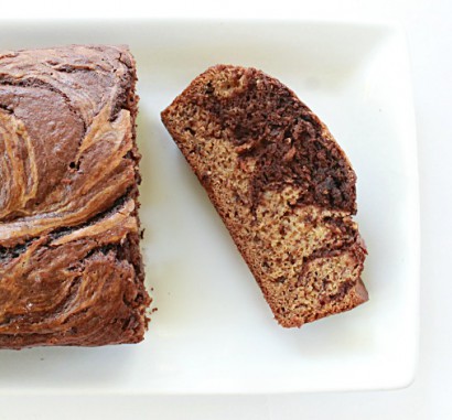 Pour the plain batter into the prepared pan. Spoon chocolate batter on top. Marble it but swirling a knife through the top. Bake 40-45 minutes or until knife inserted comes out clean.