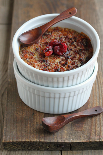 Bake for 25-30 minutes, until puffed and slightly set. Sprinkle 1 teaspoon of sugar on each ramekin and brulee with a kitchen torch for an extra touch. Serve warm.