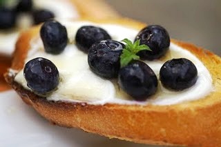 Lightly toast the baguette slices. Spread each slice with a tablespoon or so of Greek yogurt. Sprinkle a few blueberries on each piece of toast and drizzle with honey. Put a mint leaf on each for garnish. Enjoy.