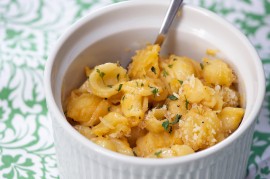This easy one-pan recipe includes plump seared shrimp in a rich and melty Parmesan sauce topped with fresh basil.