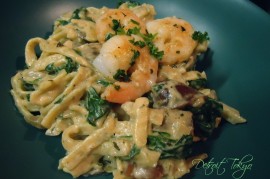 This easy one-pan recipe includes plump seared shrimp in a rich and melty Parmesan sauce topped with fresh basil.