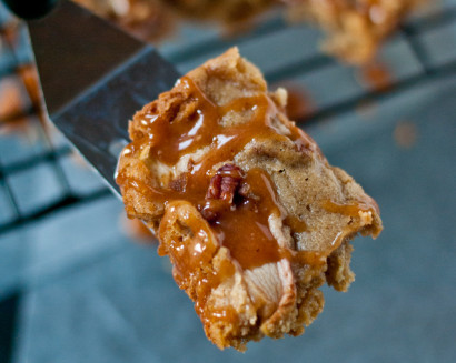 Pour all but about ¼ cup of batter into the prepared pan. Lay apple slices on top then dot with the remaining batter and scatter with pecans if desired. Bake for 25-30 minutes or until blondies are golden and set throughout. Remove from oven and set on a rack.
