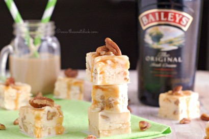 Creamy, white chocolate fudge made with Baileys Irish Cream, marbled with caramel and filled with pecans.