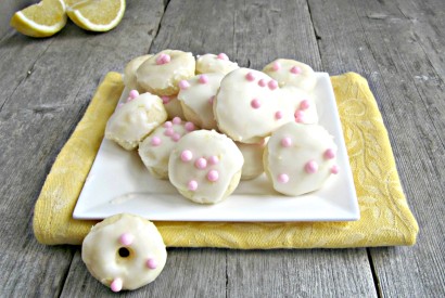 While they’re baking, make the glaze by combining the melted butter, milk, powdered sugar and remaining lemon zest in a bowl. Whisk until smooth. When the doughnuts have cooled, dip each one about halfway into the glaze and place on a rack or plate to set. Sprinkle with baking decorations, if desired.
