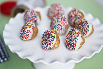 Melt the white chocolate in a double boiler. Dip 1/2 to 3/4 of each Biscoff ball into the white chocolate, and, if desired, dip immediately into a bowl of sprinkles. Return to the baking sheet to set. Repeat with the rest of the buckeyes.