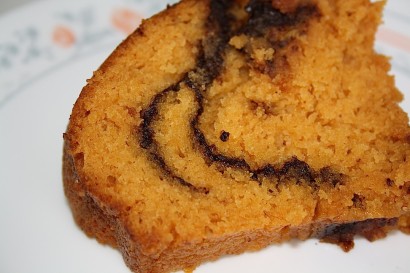 Pour batter and chocolate mixture into prepared Bundt pan, alternating between the 2 to make layers. Swirl gently with a knife.