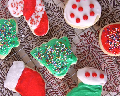 Sprinkle clean workspace with 2 tablespoons of flour. Take lump of cold dough and roll out into a rectangle. Don’t roll too flat; roll to 1/4 to 1/2-inch height. Take cookie cutters and press into dough. Place cookies on lightly greased cookie sheet. Put biggest, fattest cookies on the exterior of the pan, they’ll bake the fastest; any smaller or more delicate shapes should be in the middle of the cookie sheet. Bake approximately 8 to 10 minutes, or until golden brown. Cool on separate plate.