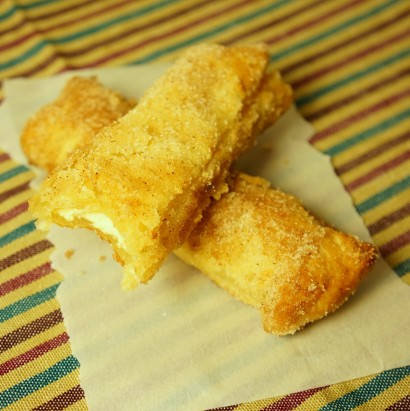 2. Scoop a little over a tablespoon of cheesecake mixture on top of each piece of pastry. Fold pastry over and press the edges closed with a fork. Bake for 10 minutes. While baking, combine sugar and cinnamon.