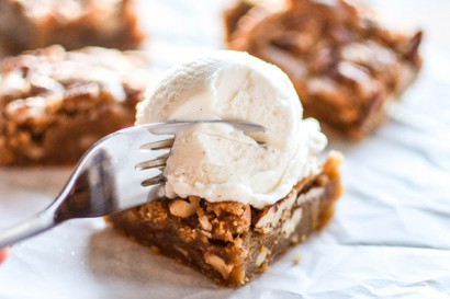 Remove from fridge and cut into bars. Store at room temperature for a couple of days. Serve with vanilla ice cream and enjoy!