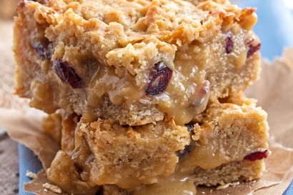 Evenly sprinkle the cranberries over the oat batter. Pour the white chocolate fudge on top; work quickly because it gets sticky if it gets too cool. Drop blobs of the remaining oat mixture evenly over the fudge layer.
