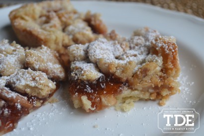 Cool completely and take the bars out of the dish using the parchment paper you left hanging out. Cut into 9 bars. Sprinkle lightly with confectioners’ sugar.