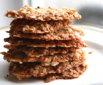 Sift together flour, baking powder and sugar. Add oatmeal, light corn syrup, melted butter, cream and vanilla. Blend well. Drop on ungreased cookie sheet 4 inches apart, using 1/4 teaspoon as a measure. Bake in a 375ºF (190ºC) oven for 5-7 minutes. Let stand a few seconds before removing from pan.