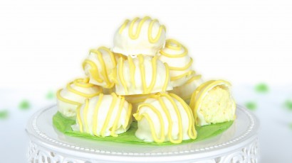 Add enough food coloring to the remaining chocolate until the desired shade of yellow is achieved. Snip about 2 mm off the tip of a small zip lock bag. Spoon chocolate into bag and twist close tightly. Pipe out spiral rings or squiggles onto the top of the cheesecake bites. Chill before serving.