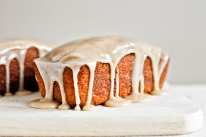 Fill each mini loaf tin 3/4 of the way full, then place on a baking sheet. Bake for 30-35 minutes, or until top is golden. Remove from oven and allow cakes to cool in the pans. Once cool, remove cakes from loaf pans and pour glaze on top.