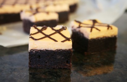 Chill in refrigerator for several hours to set completely. Remove brownies from pan using the paper ‘handles’ and cut into squares. I always use a pizza cutter and ruler to cut my squares evenly and cleanly.