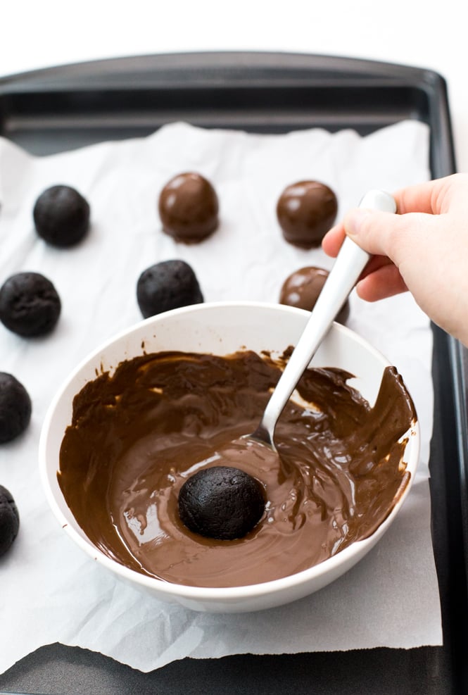Take the balls out of the fridge and dip one at a time into the melted chocolate. Place back onto the baking sheet lined with parchment paper. Sprinkle with reserved cookie crumbs. Place back in the refrigerator for 1 hour to firm up.