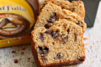 Add the flour mixture into the wet batter and mix until incorporated. Fold in the baking morsels and pour the batter into the prepared pans. Bake for 40 – 50 minutes or until a cake tester inserted in the center of a loaf comes out clean.