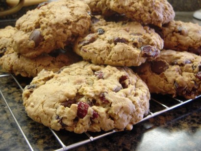 In another bowl, mix together flours, baking soda, salt and cinnamon; add this slowly to the creamed butter mix until blended. Stir in oats, then add cranberries and chips. Mix until well distributed.