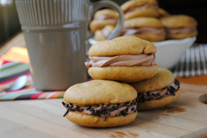 Pumpkin whoopie pies with chocolate cream cheese filling.