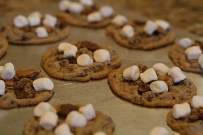 Drop dough by tablespoons onto greased cookie sheets. Bake for 10 minutes. Take out of oven and quickly add candy bar chunks and marshmallows. Return to oven and cook for 1 minute more.