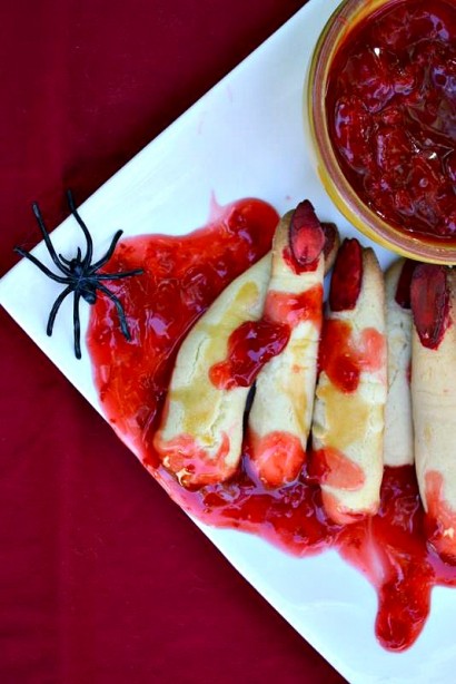 8. Drizzle cherry pie filling (mashed) over the ends of the fingers to make them appear severed. Dip fingers in additional filling and enjoy!