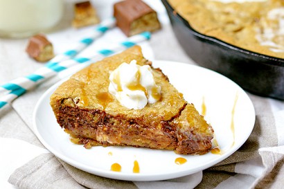 An ooey-gooey deep dish chocolate chip cookie made in a skillet and stuffed with Snickers! Don’t forget the ice cream!