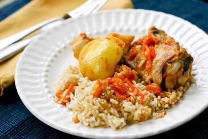 Serve over brown rice and sprinkle with golden raisins. Traditional Uzbek service is to pile the rice on a large serving platter and top with the chicken and quinces.