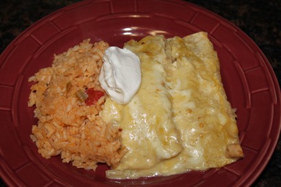 Heat a 12″ skillet on medium-high and pour in 2 tablespoons of oil. When oil is hot add the chicken. Sprinkle the chicken with a little salt and pepper for flavor and cook for about 5 minutes or until almost all of the pink is gone. Stir a couple of times to make sure that all sides of the chicken are no longer pink. Then add the onions and cook until the chicken is cooked through and the onions are translucent. Add the chicken soup, 3/4 can of the enchilada sauce, and the sour cream. Mix well and cook for about 5 minutes. If the sauce is too thick you can add a little half-and-half to thin it down but don’t make it runny. Turn off the heat and set aside.