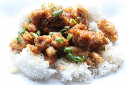 After all the chicken is cooked, take another large skillet and add the remaining 1 tablespoon oil. Heat to medium heat, then toss in ginger and garlic paste. Cook for about 30 seconds, then mix in green onions and chili flakes. Add Chinese rice wine, give a good stir, then add the sauce mixture. Cook for about 5 minutes to let the sauce thicken and sugar dissolve. Once you have accomplished that, add the chicken pieces, give a good stir, and serve over jasmine rice.