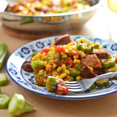 Add the corn and diced tomatoes to the pan. Also add back in the andouille sausage and the okra. Cook until everything is heated through, 3–5 minutes. Serve pipping hot and right from the pan.