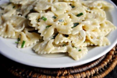 Prepare the pasta according to package directions, reserving a cup of pasta water. Meanwhile, sauté the diced shallots in olive oil over medium heat for 3–4 minutes. Once the shallots have softened, sprinkle with the flour and cook for one minute. Stir in white wine until flour is dissolved and bring to a simmer. Then reduce heat to medium-low and add heavy cream, chives, lemon juice, salt and pepper. Grate a teaspoon of lemon zest and 1/2 cup Parmesan over the pasta and toss. Thin out with a little of the reserved pasta water, then divide among four plates and garnish more Parmesan if desired.
