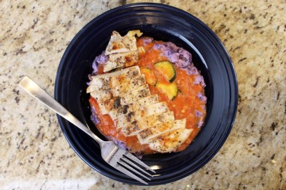 To serve, make a bed of the mashed potatoes, then top with some of the zucchini sauce. Thinly slice the chicken and serve over the rest of the meal.