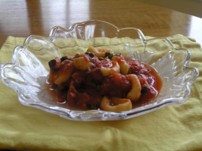 “Little ears” of fresh pasta cradled in a chunky roasted garlic puttanesca sauce.