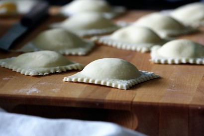 Place another piece of dough down on top of the filling. Roll over it with a rolling pin. Remove the ravioli from the form and crimp the edges with a fork so you don’t lose any filling while it cooks. Let the ravioli sit out long enough for them to dry out.
