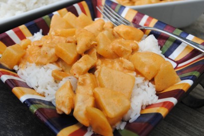 Pour coconut milk into a measuring cup. There should be about one cup’s worth of watery milk, and about 2 cups’ worth of cream. Pour the watery milk into a small saucepan and add your bite size chicken to the pan. Simmer until meat is fully cooked (about 10 minutes). If your coconut milk doesn’t separate, just put 1 cup of the cream in the pan with the chicken. It will still work fine.