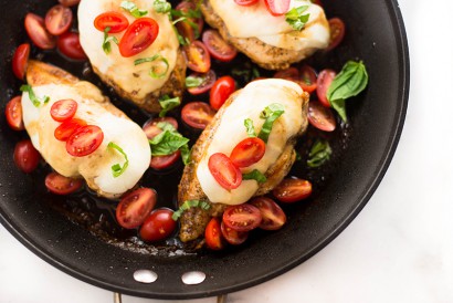 Add thinly sliced fresh mozzarella over the chicken breast, and cover for 1–2 minutes to melt. Scoop up the balsamic sauce from the pan and drizzle over the chicken and melted cheese, then add the grape tomatoes into the pan.