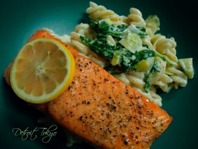 To serve, toss pasta and vegetables with sauce. Divide into portions. Serve each with salmon on top or alongside. Enjoy!
