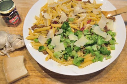Cook pasta as per box instructions and drain. Dice the broccoli (florets and stem). Use the pasta pot to combine the penne and the sausage mixture (coating each piece of penne well with oil), reserving a tiny bit of oil in the sausage pan. Throw the broccoli into the garlicky oil and toss on low until warmed. Salt and pepper both pasta and broccoli.