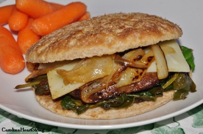 Of my contributions this is by far my favorite “creation” for our month of healthy recipes. I had always been curious about portobello “burgers” on menus but didn’t want to order one out when there were less healthy (ie: more tempting) items on the menu. Wow. This mushroom rocks. In an effort to be healthy I didn’t serve this with any mayonnaise or spreads especially since the flavors and moistness needed no help!