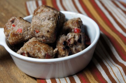 In a large pan, heat some of the olive oil. Combine the rest of the ingredients together and mix well. Form mixture into small balls and place in the heated olive oil. Shake the pan every few minutes to get the meatballs cooked well all the way through. Cook until the centers are no longer pink and the outside starts to get slightly crispy.