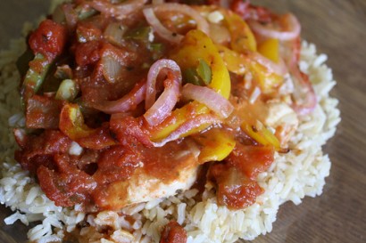 Bake uncovered for 25-35 minutes or until chicken is no longer pink and peppers are softened. Serve atop rice.