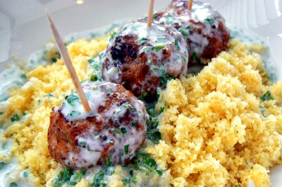 5. Serve the meatballs over a bed of couscous and pour some garlic coconut sauce on top.
