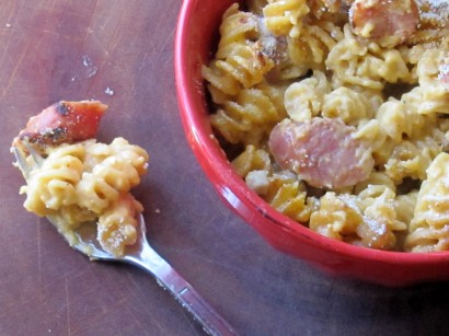 It contains whole wheat goodness from the pasta, lean chicken sausage, fat-free evaporated milk rather than regular evaporated milk and reduced fat sharp cheddar that still holds its flavor.