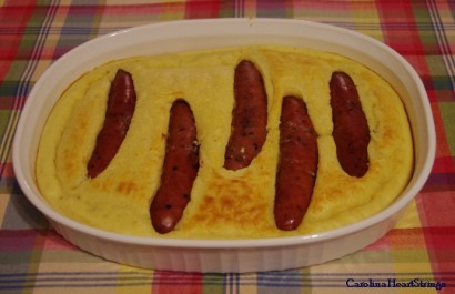 Meanwhile heat a 9×12 dish in the oven at 425 F while it preheats. Once the oven and dish are hot remove the dish from the oven and spray with vegetable oil. Pour in the batter and arrange the sausages so that they are somewhat covered (see photo).
