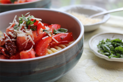 Begin to make the sauce once you put the pasta in the boiling water. In a large saucepan, heat olive oil over medium-low heat. Add the garlic and stir until lightly browned, about 2 minutes. Add the sundried tomatoes and regular tomatoes and cook for about 3 minutes, until both types of tomatoes are heated thoroughly.